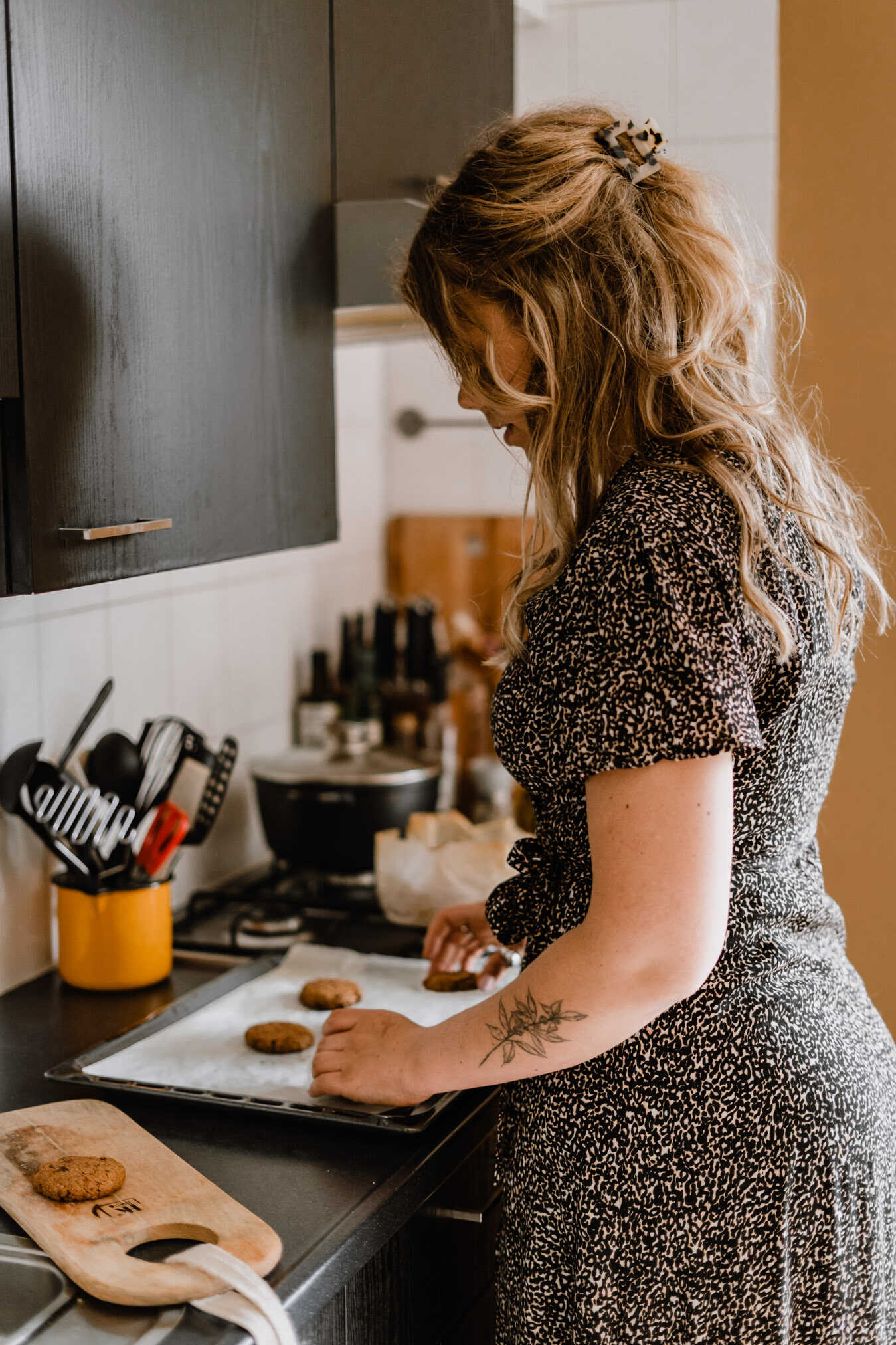 - duw de bolletjes deeg een beetje plat op de bakplaat, niet té plat, want dan worden ze te dun: ze lopen namelijk nog wat uit.