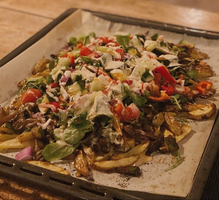 - Haal de bakplaat uit de oven en doe eerst de sla, dan de rauwkost en dan de saus over de aardappels en de oesterzwamkebap.