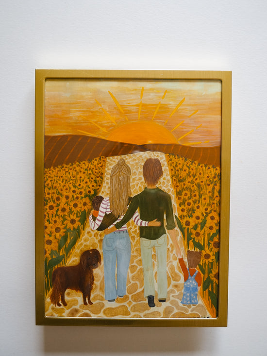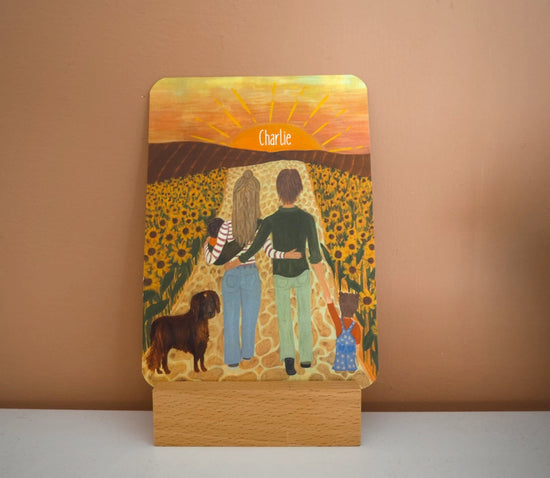Voor Bo en Edwin mocht ik een super persoonlijk geboortekaartje ontwerpen. Zelf staan ze, met dochter Charlie, Nova en hondje Bobbie voorop de kaart, wandelend door een zonnebloemenveld. -
