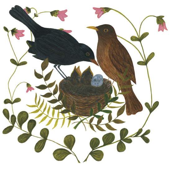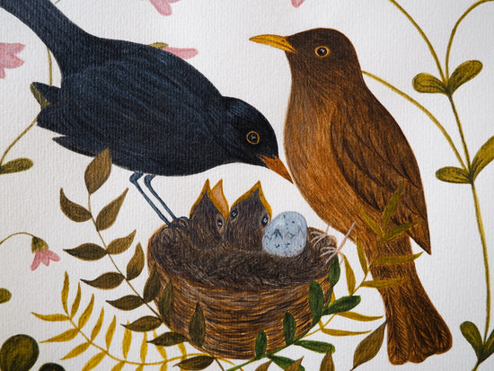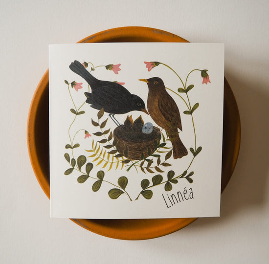 Linnéa (blomma; de bloemetjes) met een merelsnestje, want haar tweede naam is Merel. Immie en Remco wilden iets met vogels en de natuur en gaven mij verder alle vrijheid. Zo ontstond dit ontwerp. Ze hebben al 2 kindjes, dus er zijn al 2 eitjes uitgebroed.