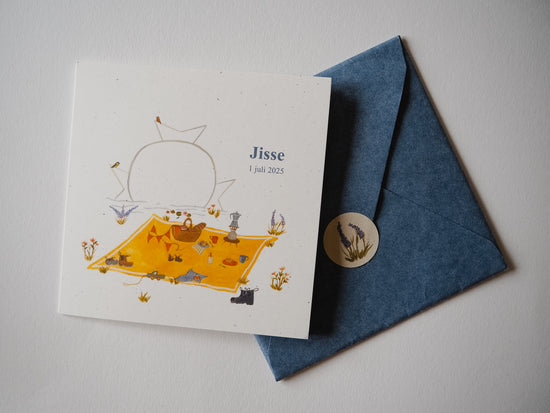 Dit geboortekaartje heeft alles wat de ouders van Jisse er in verwerkt wilde hebben, waardoor het een mega persoonlijk ontwerp is geworden: een picknick in de natuur, het elfstedenkruisje, geboortebloemen, koffie, blundstones, een pick-up truckje en kaneelbroodjes. Ohja, en de oranje vlaggetjes? Die verwijzen naar koningsdag, de dag waarop ze elkaar ontmoet hebben. Hoe leuk is het om zo'n uniek geboortekaartje te hebben voor je (eerste) kindje? 🌞