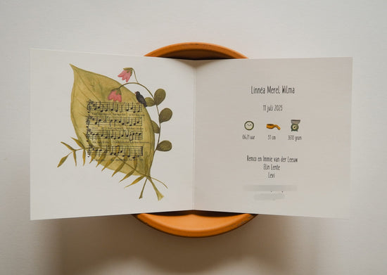 In de binnenkant van de kaart illustreerde ik een notenbalk van een liedje wat hun dochter ingezongen heeft. De link naar dit liedje hebben ze meegestuurd met het geboortekaartje, hoe origineel!