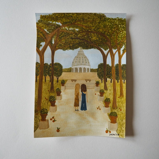 Deze vrouwen hebben elkaar (zonder dit van elkaar te weten) op hetzelfde moment ten huwelijk gevaagd in de sinaasappeltuin van Rome, hoe bijzonder is dat? Extra waardevol dus om deze herinnering (inclusief meer persoonlijke details, zoals de kleding die de dames dragen) en dit mooie moment te vereeuwigen in een illustratiekunstwerk.
