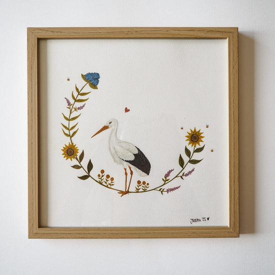 Het leuke aan het analoog (met de hand, op papier) ontwerpen van een illustratie op maat is dat aan het eind van het proces de originele illustratie 'over' blijft. Deze lijst ik altijd voor je in en krijg je cadeau. Dit kun je in huis ophangen zoals in dit geval bijvoorbeeld in de babykamer.