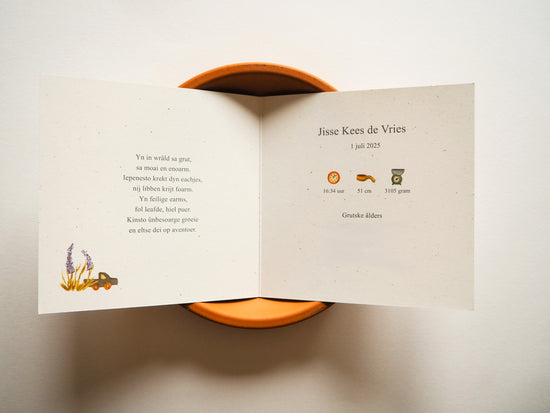 De binnenzijde van het geboortekaartje van Jelte, volledig in het Fries.