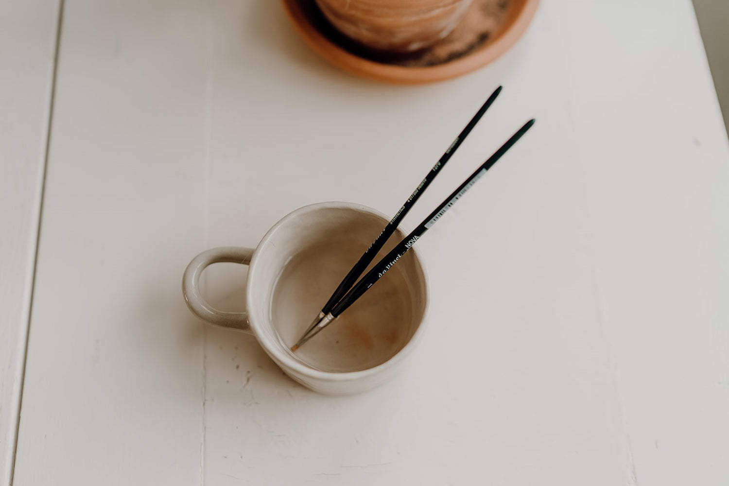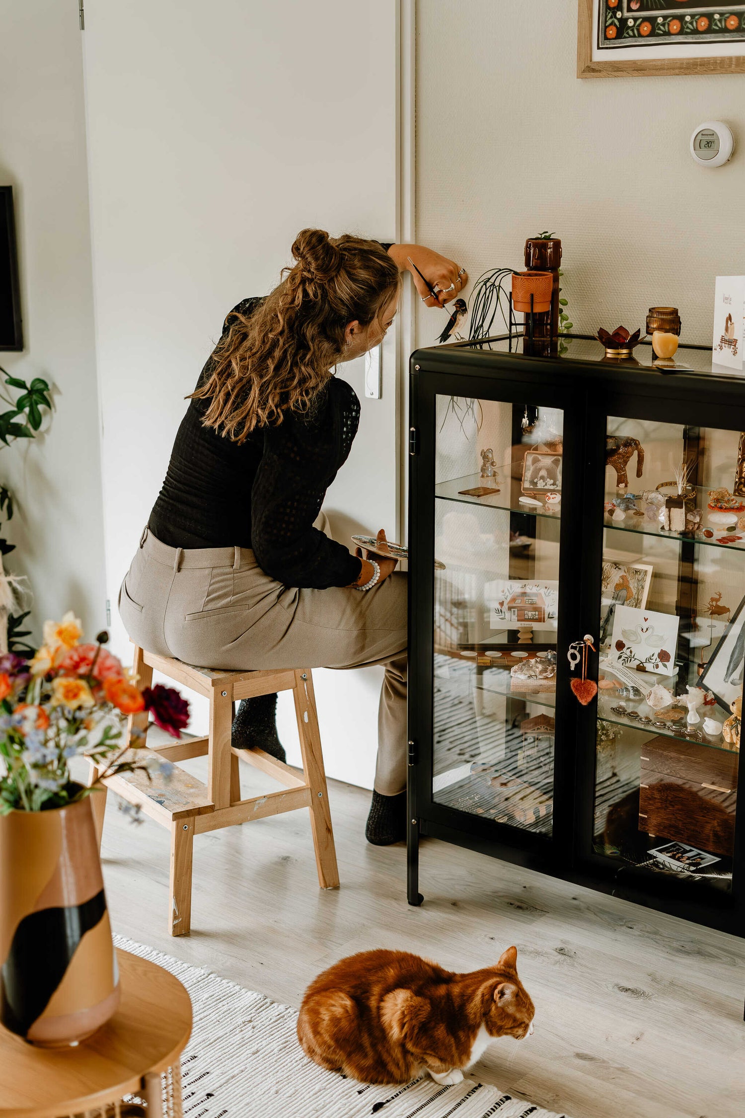 Jouw muurschildering is af. Ik ruim m'n spullen op, schuif de meubels terug op z'n plek, spoel m'n kwasten schoon en ik maak foto's van het eindresultaat.