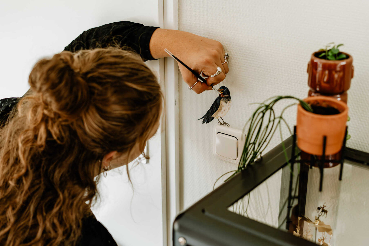 Wat is jouw favoriete vogeltje? Een huismus, koolmees of roodborstje; het maakt mij niet uit. Ik schilder jouw lievelingsvogel natuurgetrouw op je muur, stopcontact, lichtknopje of waar je het vogeltje maar in gedachte hebt.